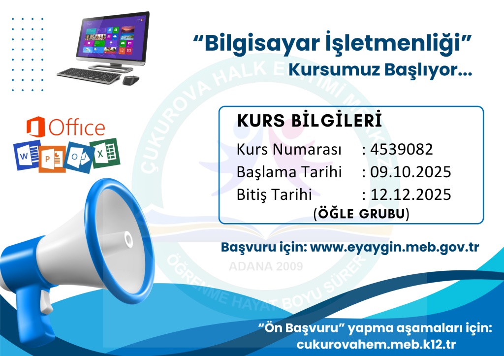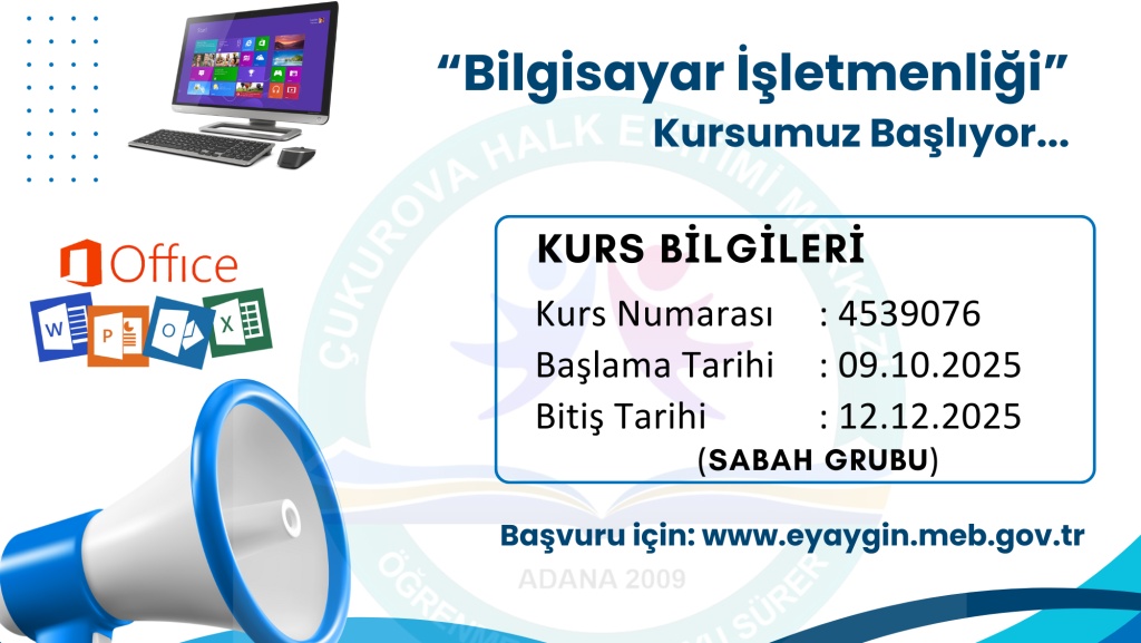 Merkez binamızda, Sabah ve Öğle olmak üzere 2 "Bilgisayar İşletmenliği (Operatörlüğü) Kursu" başlayacaktır.